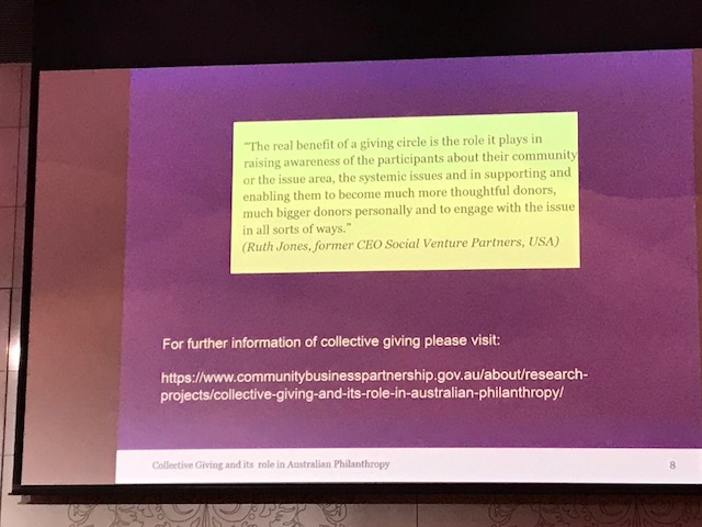 And – high fives here – Dr Alice Hill of the Antipodean Family Foundation reminded us that story-telling is still important. And we were lucky enough to see this in action as the Funding Network staged a live pop-up Collective Giving event with three grassroots organisations pitching their case for support in just three engaging minutes each -– that’s how our elevator pitches should be. Take note!